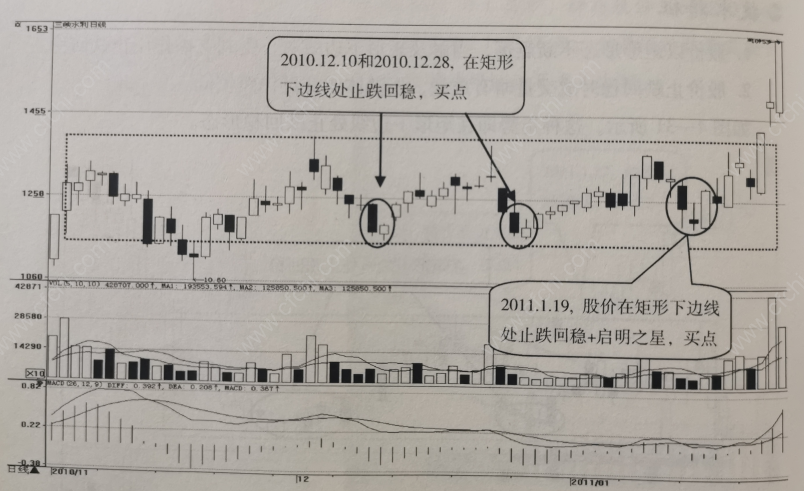 1、股价以矩形形态不断震荡,当触及矩形下边线时,收到支撑作用止跌回稳;