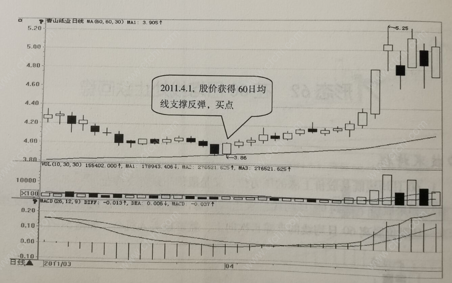 2、如果股价在60日均线位置获得支撑之前股价缩量下跌,而在之后获得支撑上涨时成交量放大,则该形态的看涨信号会更强烈;