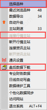 二、其中系统菜单比较常用的是选择品种(选择你要交易的股票的类型)、连接行情主站、盘后数据下载,建议每天收盘后进行盘后数据下载,也可以设置为每天自动下载。
