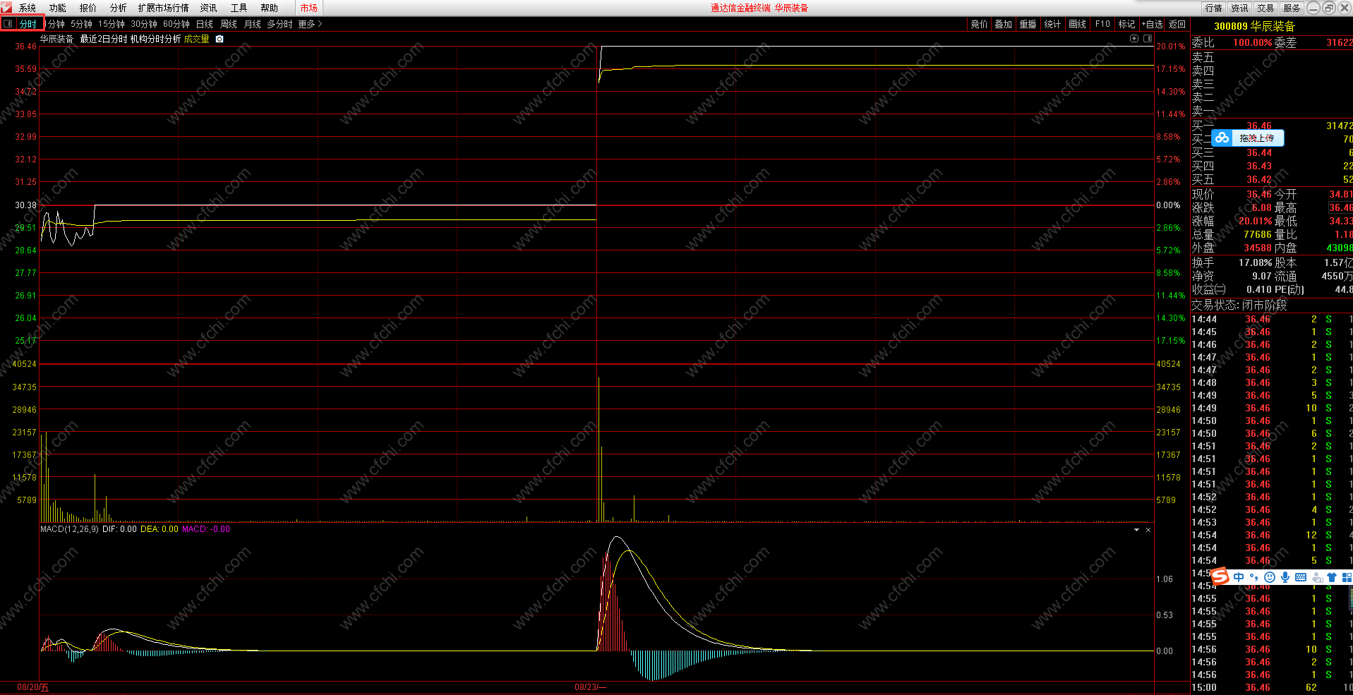 即时分析:可以看到一支个股的分时走势(也就是常说的分时图),也可以进入某个个股的K线图线面后点击分时按钮查看分时图