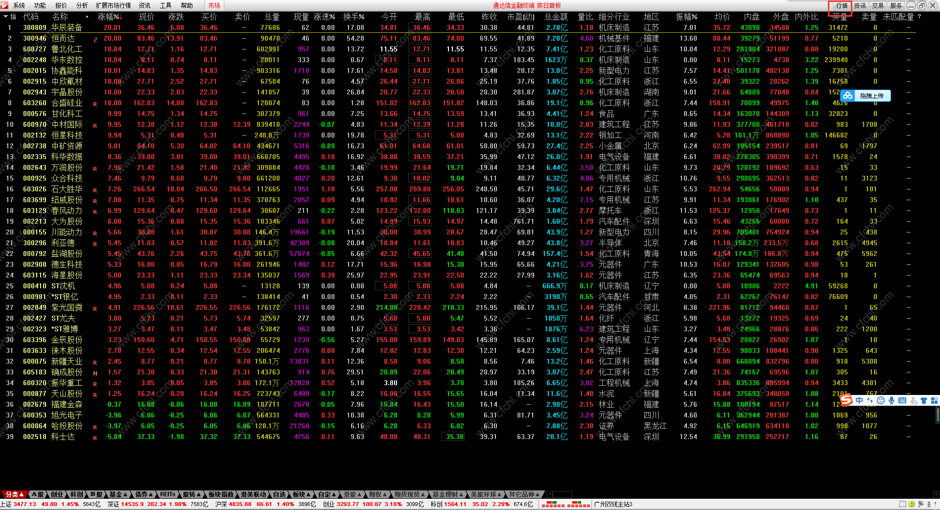行情分析:可以看到各个个股的涨幅情况,也可以直接点击软件的右上角的行情按钮