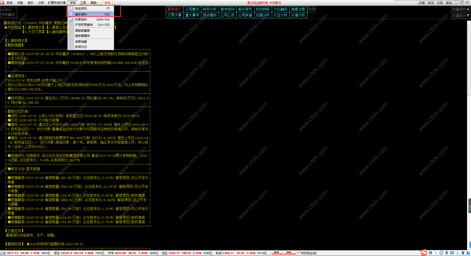 四、资讯菜单最常用的就是财经资讯跟基本信息两个菜单,点击财金资讯(快捷键F7)可以查看财经资讯信息,点击基本信息(快捷方式F10)可以查看某支个股的基本信息