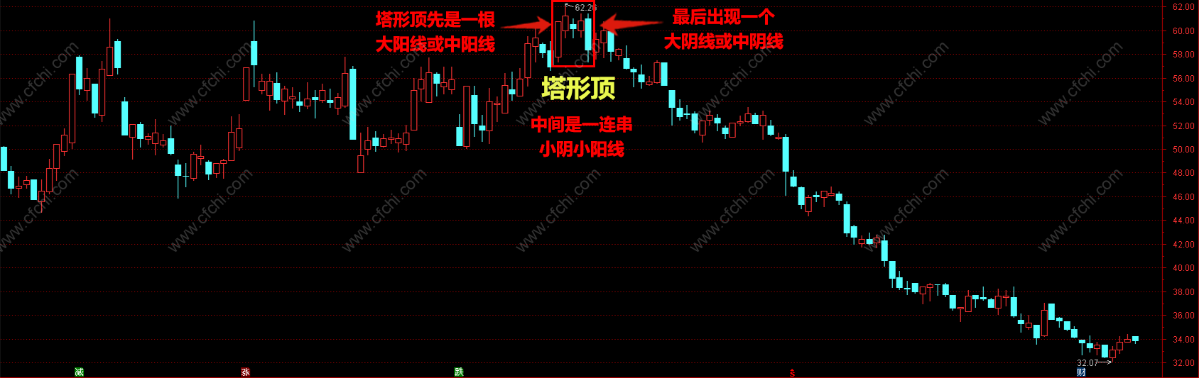 塔形顶由多根K线组合而成,形状像塔顶,它先是一根大阳线或中阳线,然后出现一连串的小阴小阳线,最后出现一个大阴线或中阴线来确立塔形顶的形成。