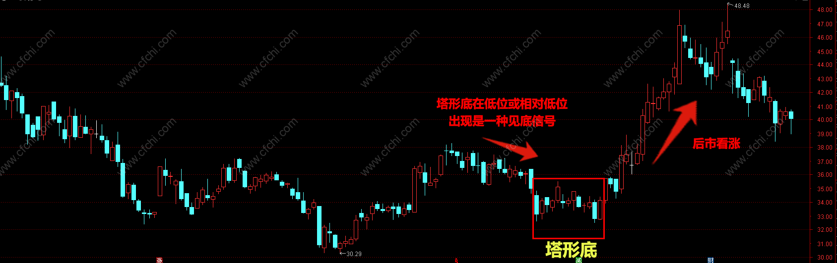 塔形底一般出现在下跌趋势中的低位或相对低位区域,在低位或相对低位出现是一种见底信号,后市看涨,可参考买入,如果在大幅下跌之后之后出现,并配合放量大阳线,可靠性更强。