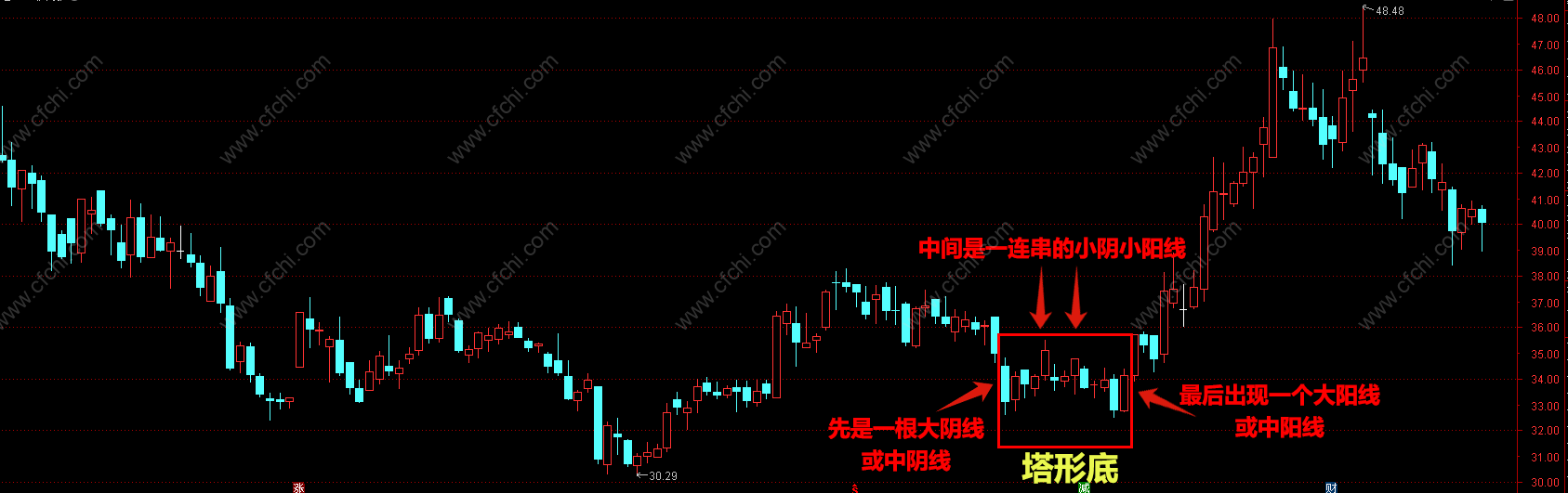 塔形底由多根K线组合而成,像倒扣的塔底,先是一根大阴线或中阴线,然后出现一连串的小阴小阳线,最后出现一个大阳线或中阳线来确立塔形底的形成。