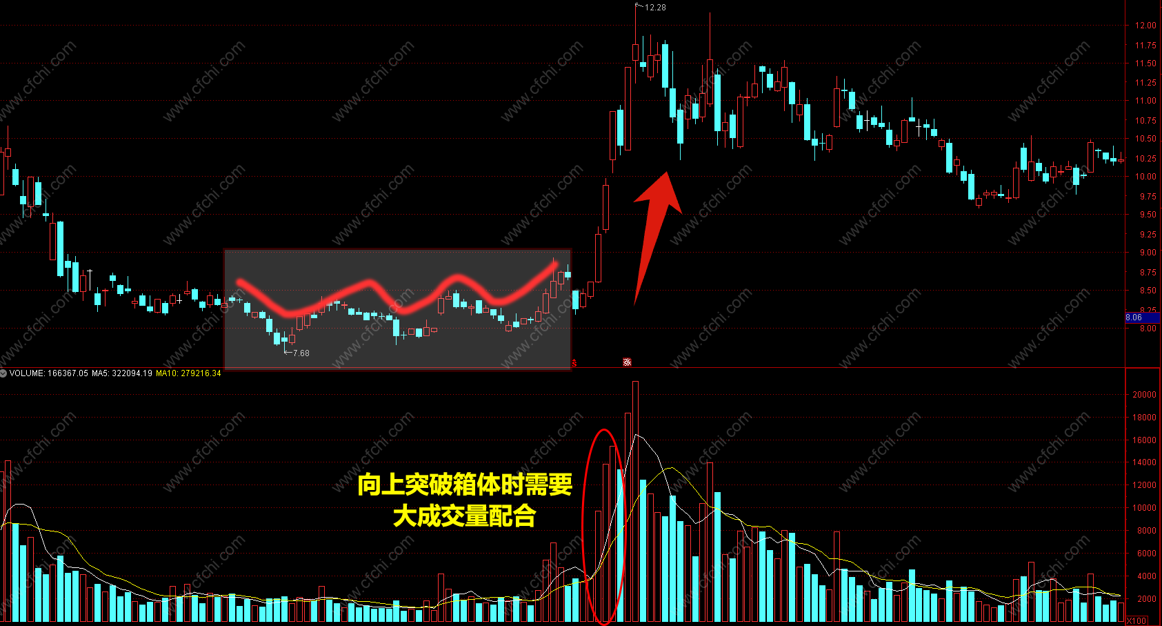4.如果在箱体过程中,成交量逐渐变大,可能是主力机构护盘出货,即使往上突破也很可能是一个多头陷阱,投资者对此要有警觉。