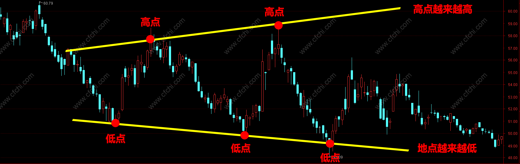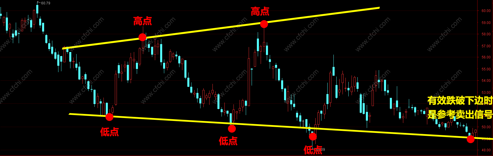 2.高低与低点的连线相较于左方,呈向右扩散状,形状像一个喇叭