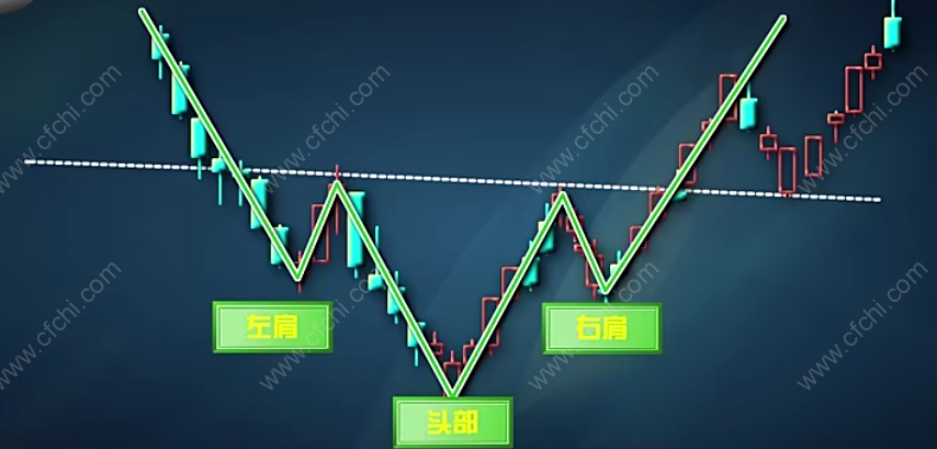 头肩底形态,常见行情下跌的尾声中出现,是止跌反转的典型形态,犹如倒置的两个肩膀扛一个头,股票价格从左肩处开始下跌至一定深度后弹回原位,然后重新下跌超过左肩的深度形成头部后再度反弹回原位,第三次下跌时,跌至左肩位置想成右肩后开始第三次反弹,这次反弹的力度大,很快穿过颈线并一路上扬。