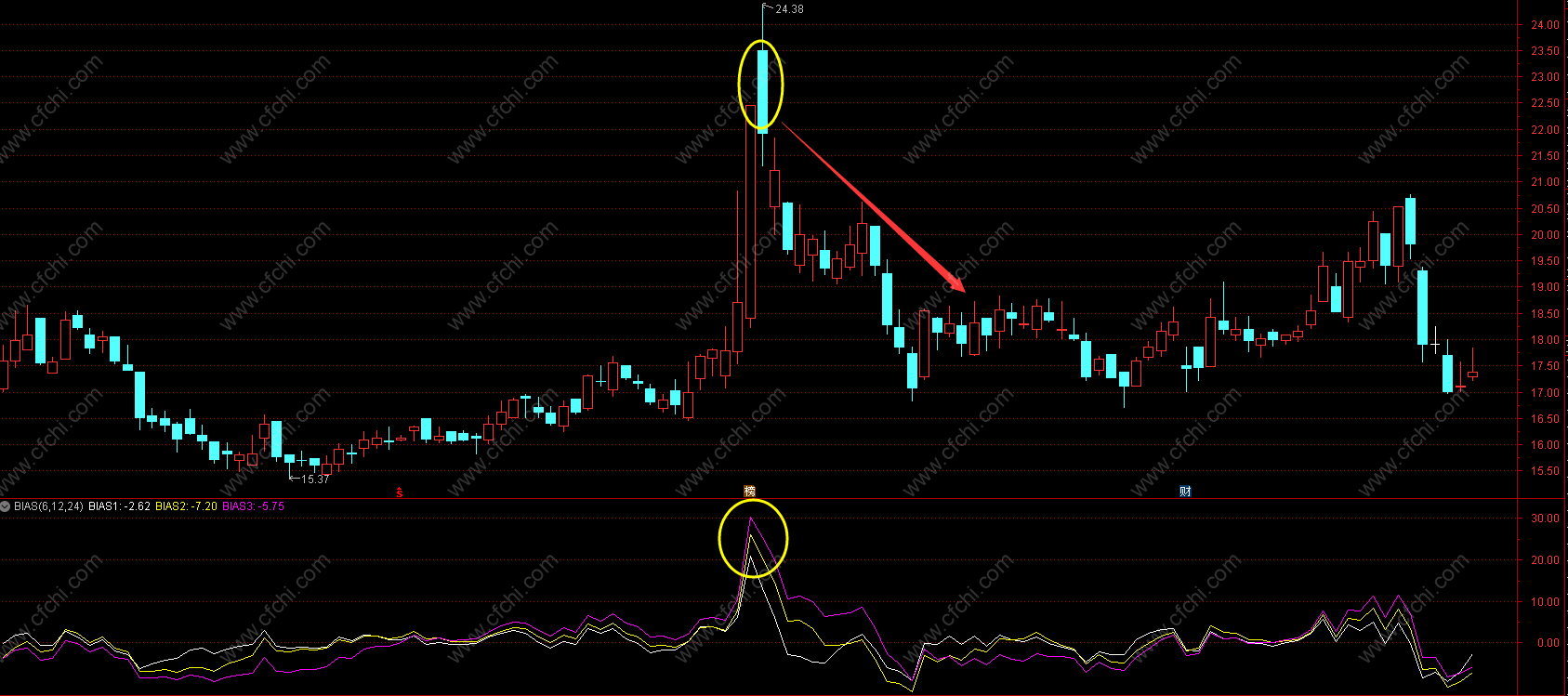 白色信号线表示股价和6日移动平均线的偏离程度;黄色信号线表示股价和12日移动平均线的偏离程度;紫色信号线表示股价和24日移动平均线的偏离程度;