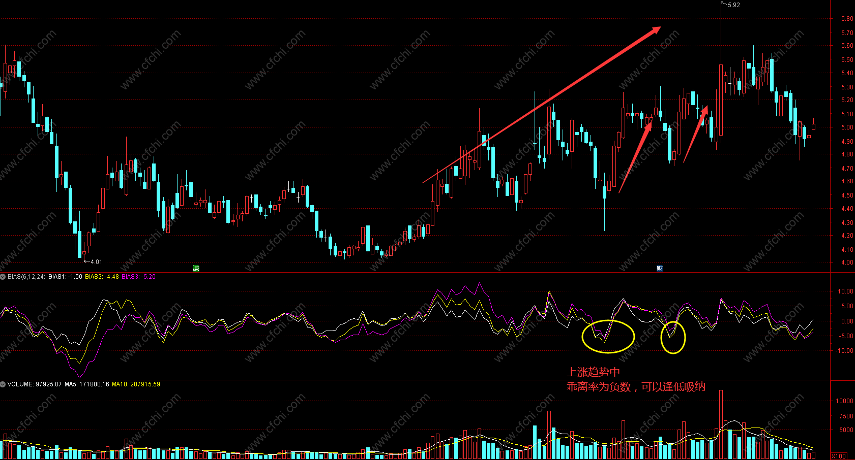 ④在基本趋势为上升态势时,乖离率出现负数,此时入市风险较小,可以逢低吸纳,反之下降趋势时,乖离率出现正数,可以逢高抛售
