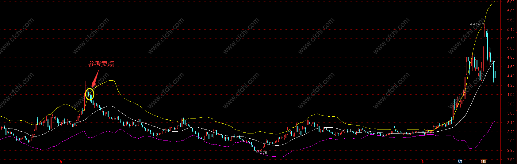 ②股价向上穿越或接近上轨时,收到上轨压力,中短期可能下跌,为参考卖出点