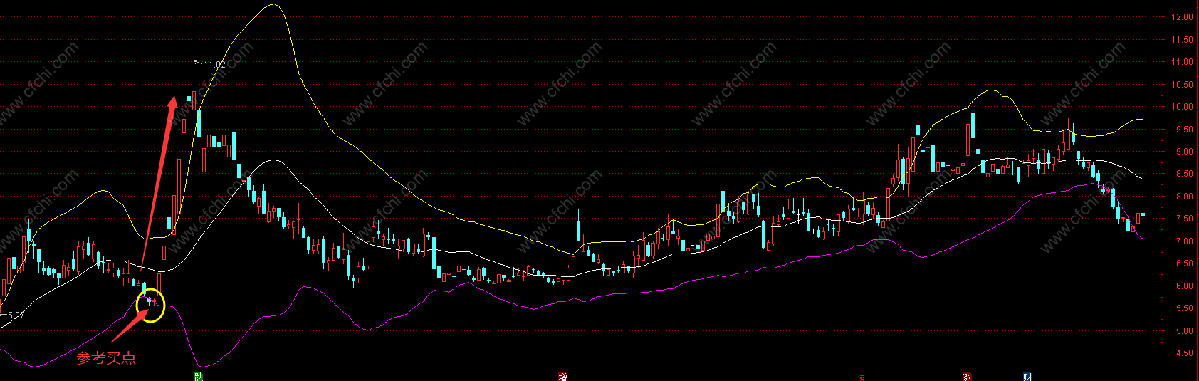 ①股价向下击穿或接近下轨时,受到下轨支撑,中短期可能上涨,为参考买点
