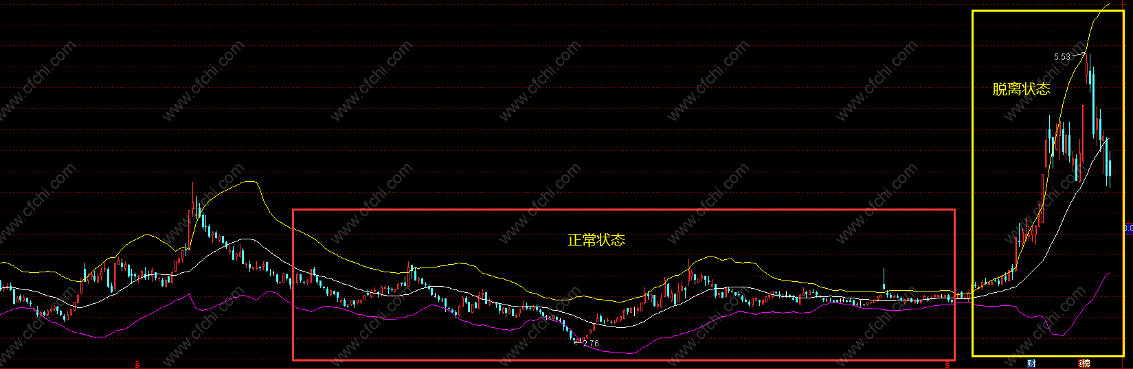 ③当布林线的带状区呈水平方向移动时,可以视为处于常态范围,采用上述操作方法可靠性较高;当布林线的带状区域朝右上方或是右下方移动时,则属于脱离状态,采用上面两个方法失误率增高