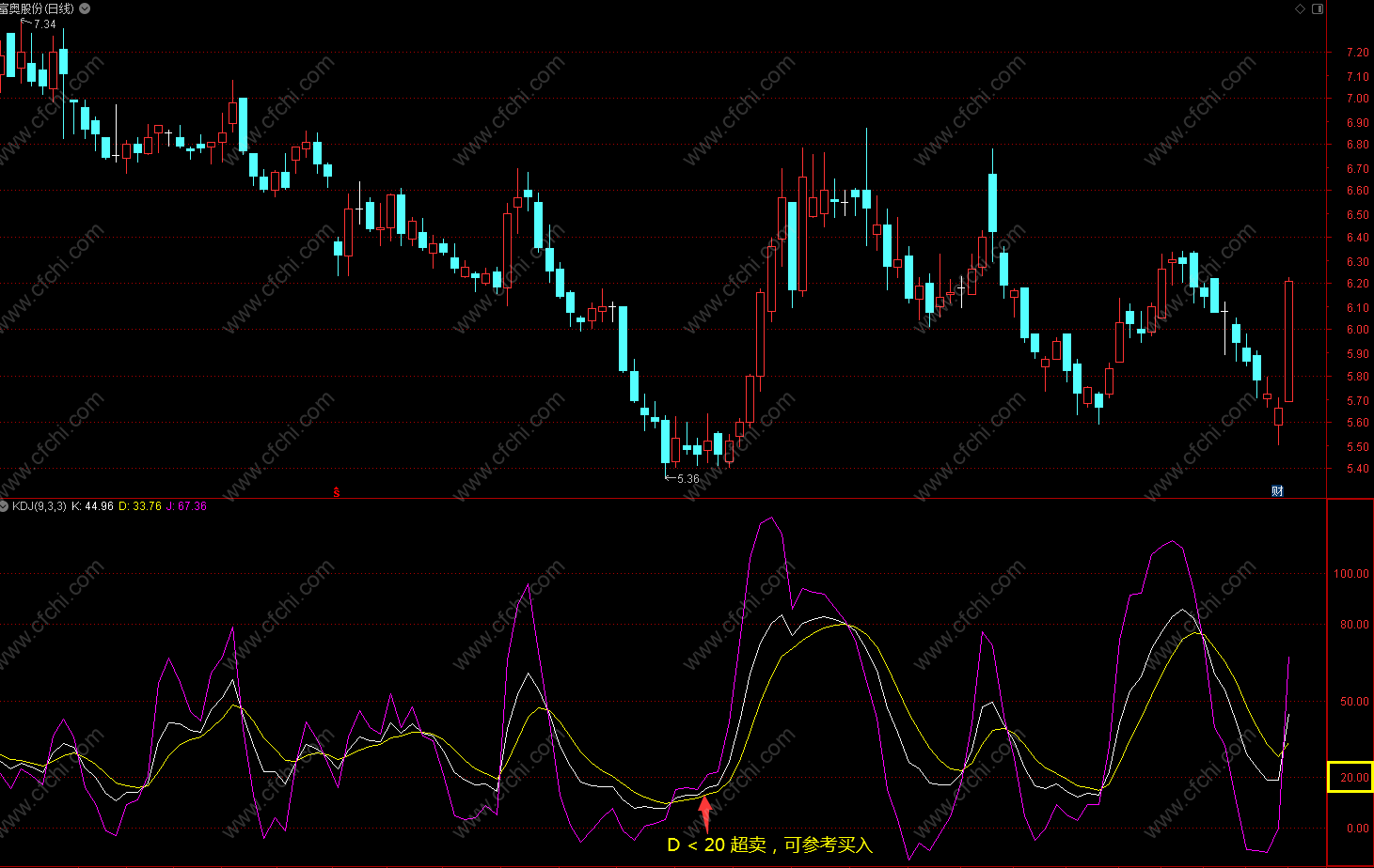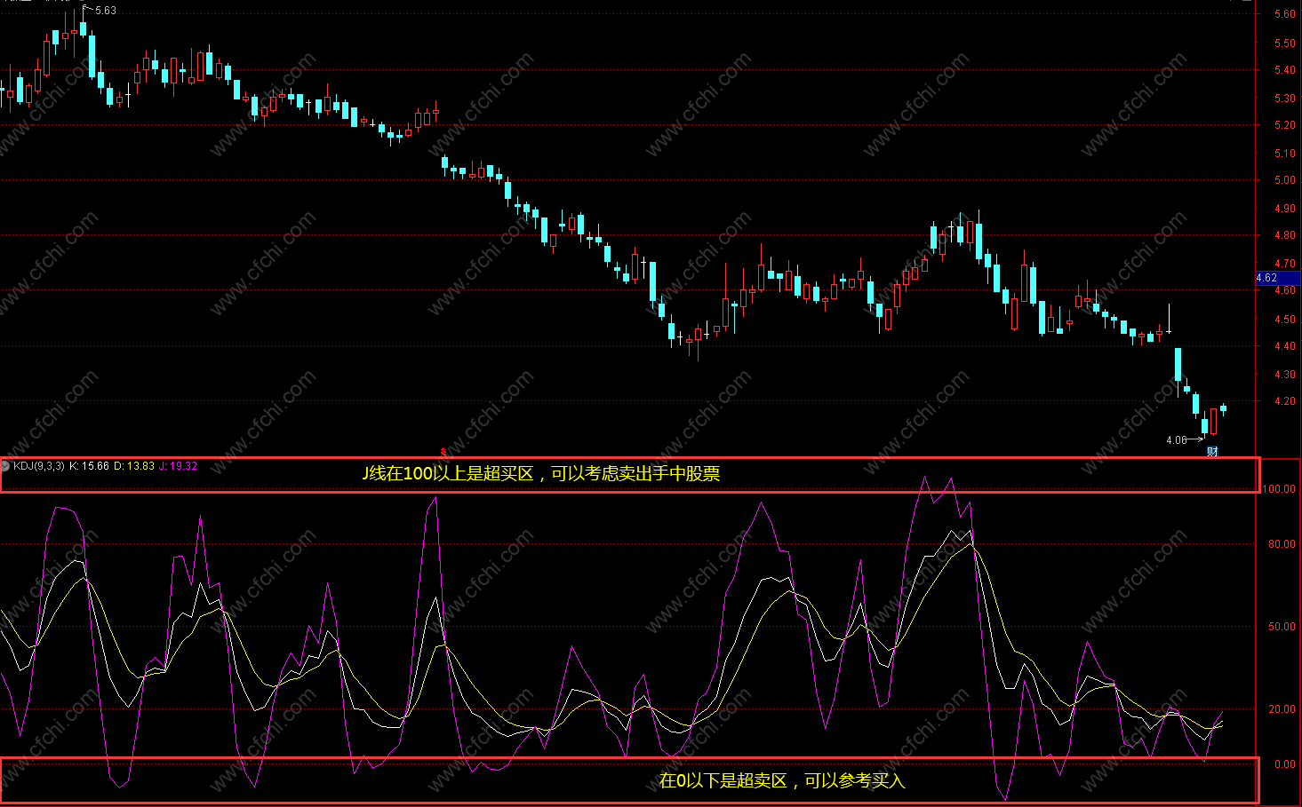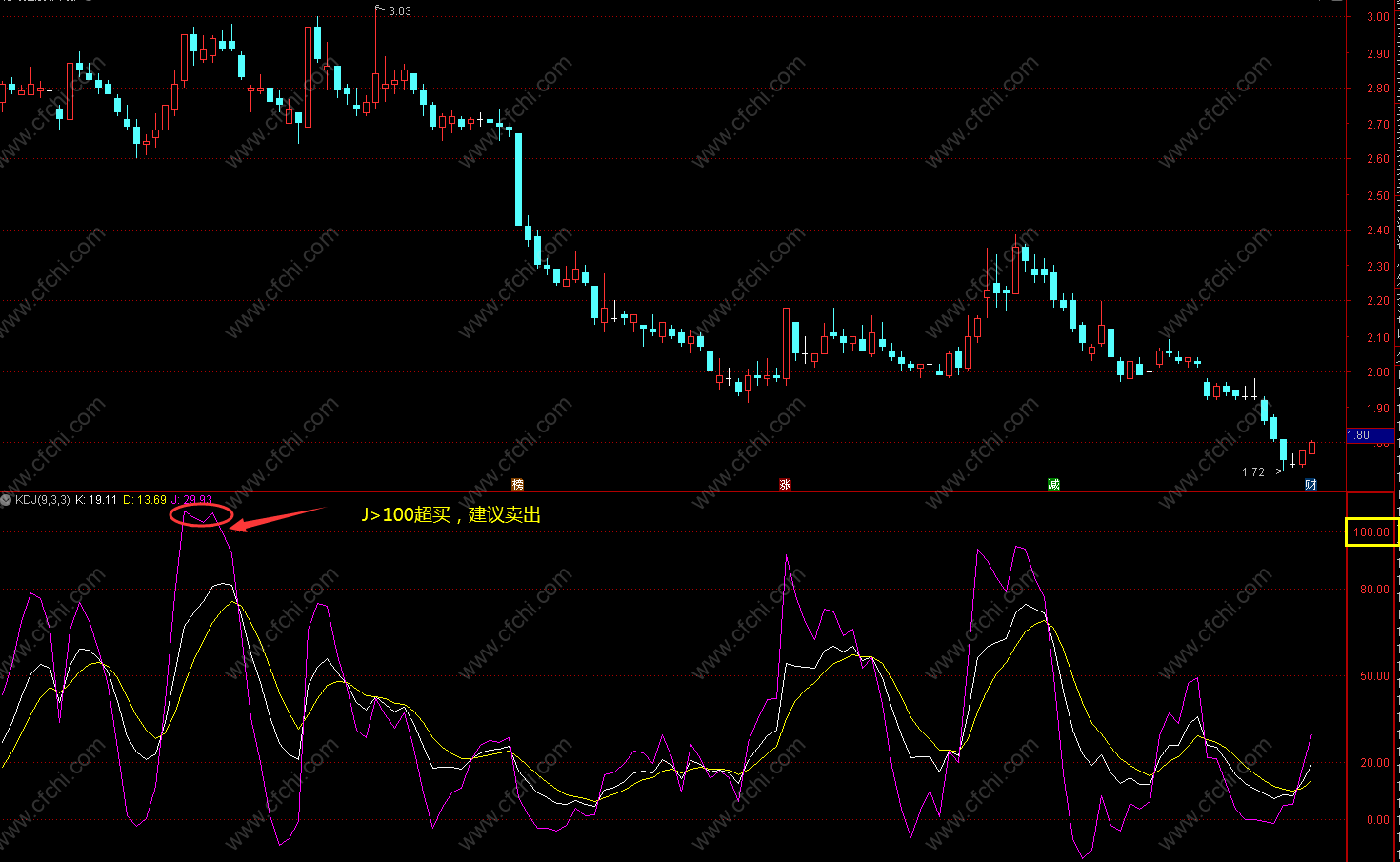 J线的取值可以超过100,也有可能是负值,在100以上是超买区,在0以下是超卖区,在超买区可以考虑卖出手中股票,在超卖区可考虑买入股票