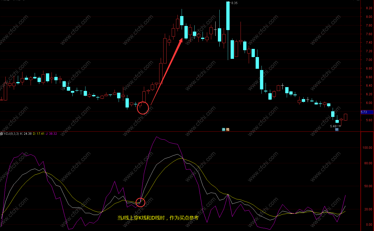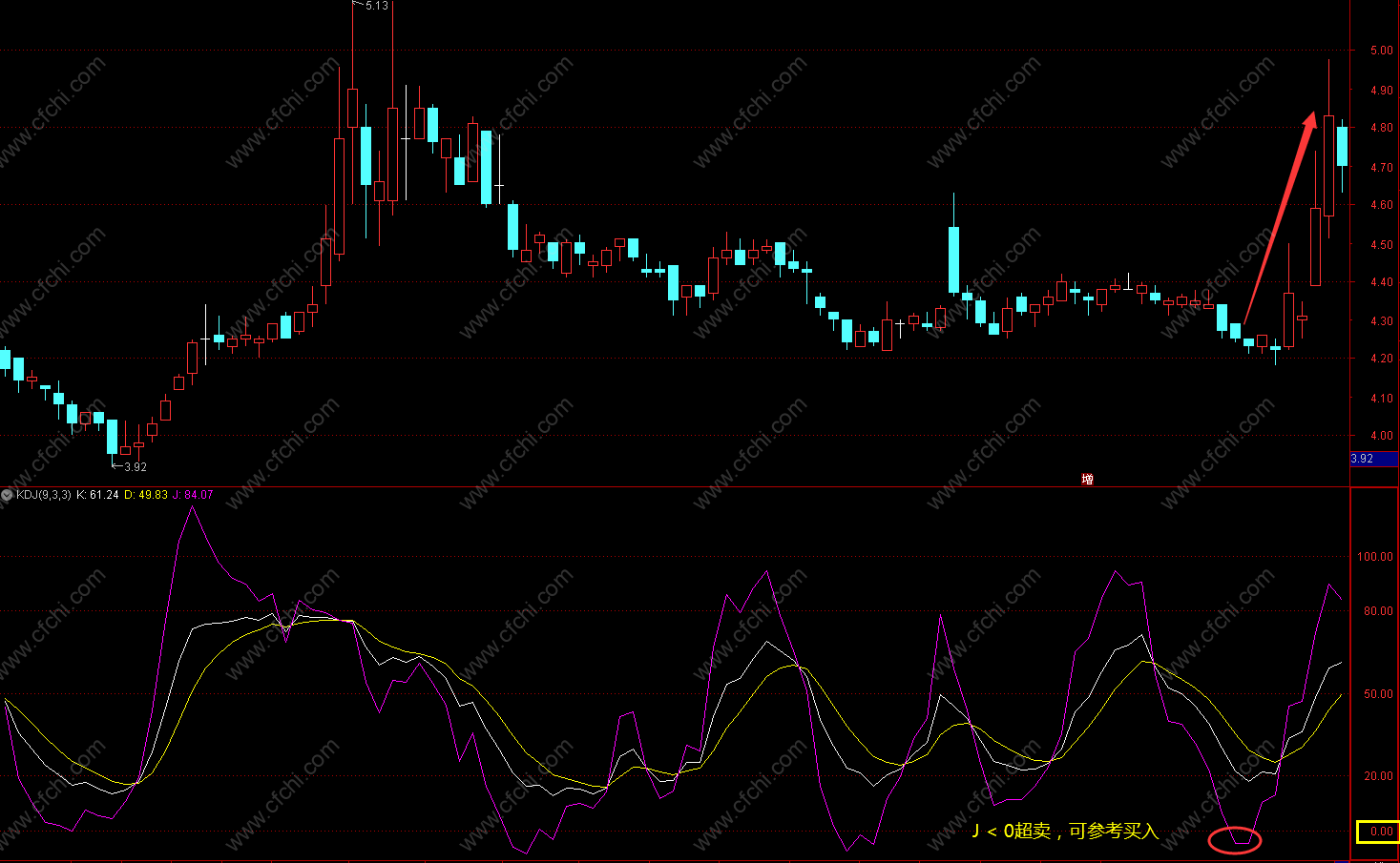 ①当J线自下而上穿破K线和D线时,作为买点参考