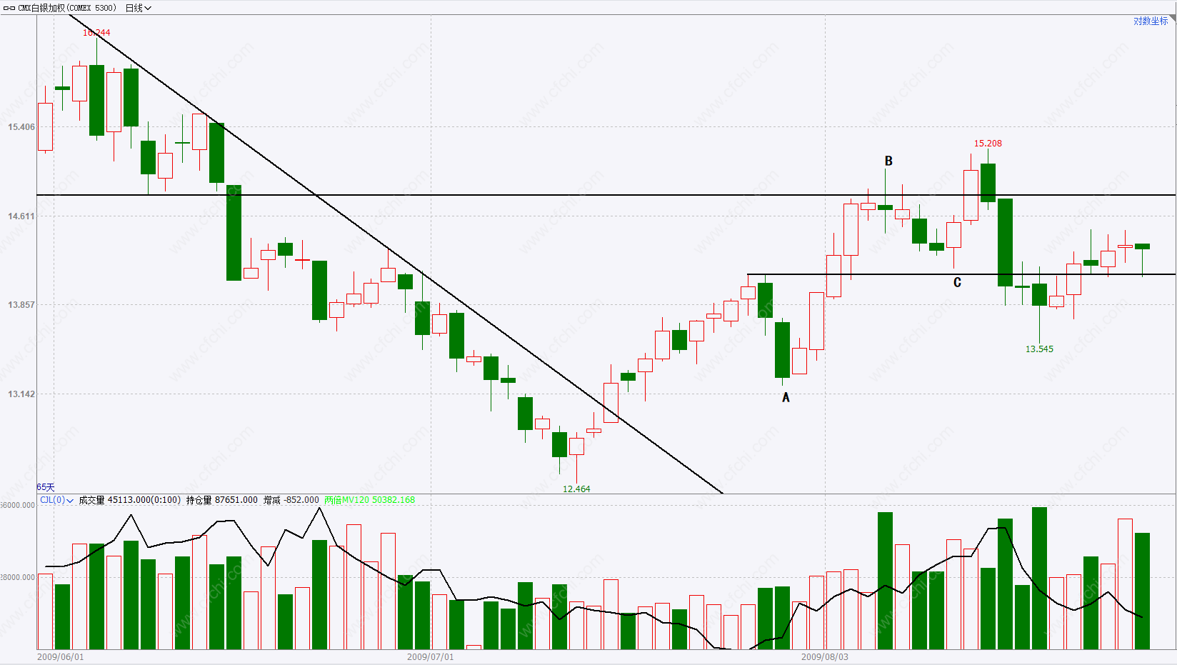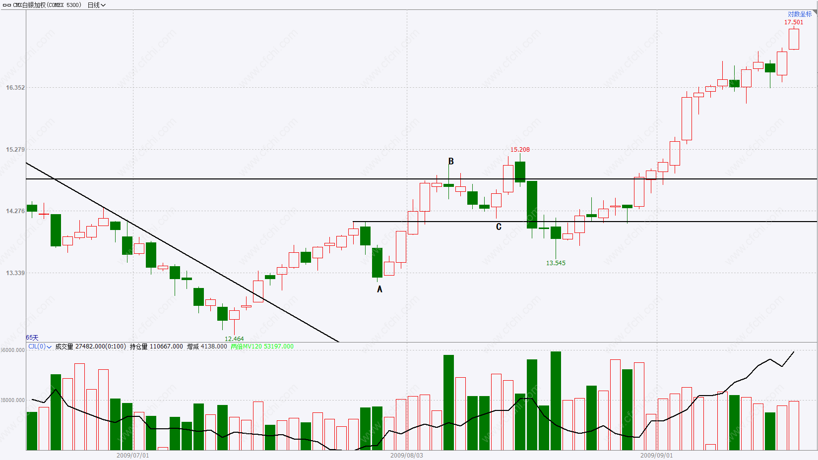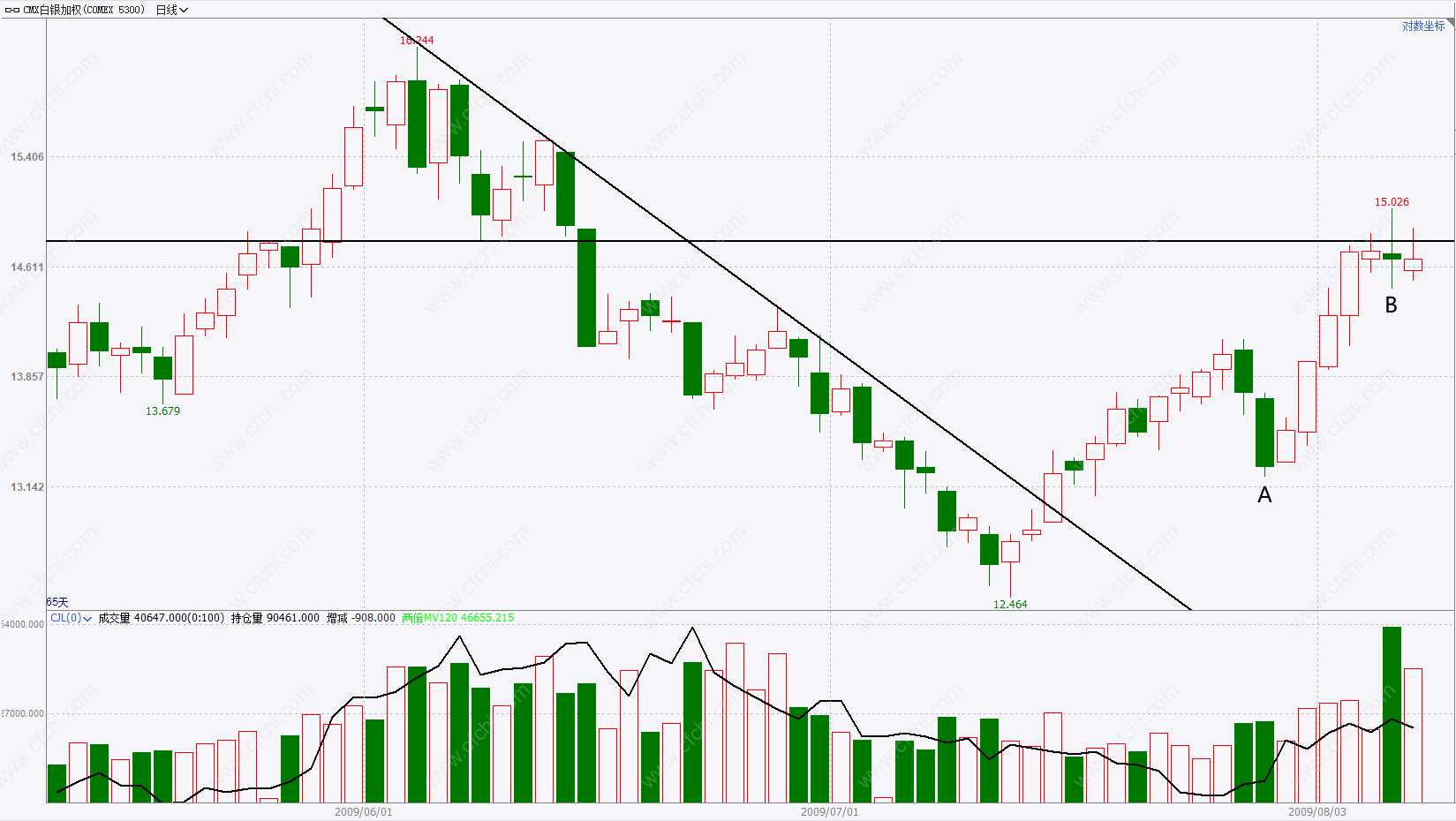如图1.1所示这是2009年8月份期间的美国白银期货日线。