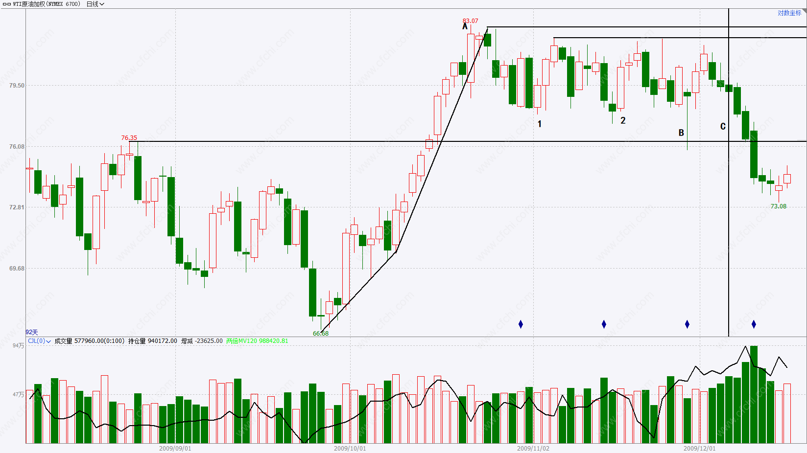 在B的位置,一笔大的资金进来,把价格推起来。但是这次努力没有成功,因为价格没有创新高。或者说,在当天的高点价格,没有更多的资金涌进来把价格推向更高,这就需要一个强有力的跟随,来证明需求的强劲。但是接下来的反弹刚刚创新高之后就被抹平(三低出现),需求仍然不足。特别是接下来三天的回落,成交量是递增的,供应的压力在扩大。到这里为止,做多的持仓条件根本不具备,完全是相反的秩序,应该立刻离场。这里我们得一个教训,熊市中的长下影线的低点更重要,因为它表明熊市秩序的延伸。原油接下来下跌到12月14日,接近图中左侧底部的VDB中部。