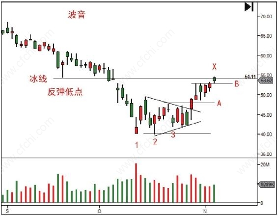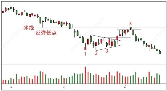 如图2.3所示,在冰线出现卖盘跟随(X后面一根:量增三低),确认了SOT的停止行为,供应大于需求。破冰回测做空是一个常用的交易策略。这个策略成功的关键是进场后必须有跟随(三低量增)。阻力区是个很微妙的地区,判断其是否成立的关键是回落中的成交量(必须增加才能确认阻力成立)。