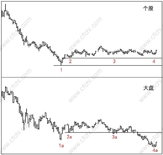 图1.1是股票和大盘的对比图,上方是个股,下方是大盘,直观上看,这个股票现在值不值得买?在1和1a的位置,个股和大盘都创了新低。回升后,看价格回落幅度2和2a,大盘回落接近50%,但是个股回调仅仅30%,说明个股强于大盘。但是当大盘反弹的时候,个股不但跟随反弹,而且反弹幅度强于大盘。同样3和3a相比,个股回落幅度小于大盘,而反弹幅度大于大盘,再次说明个股强于大盘。