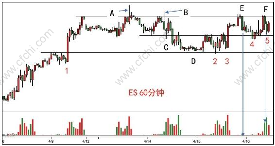 E和F创局部新高,伴随巨量买单。但是内涵上依然隐藏着市场的弱势,因为努力没有结果。到此为止,市场自从A那里急速上涨以来,多数都是出货特征,很少有需求恢复强势的表现,告诉我们市场背景已经转变,上涨趋势的秩序被打破,多仓是离场的时候了。