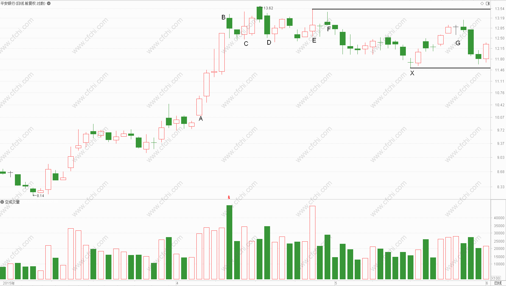 X的量价行为说明供应枯竭,后面的量增阳线说明有买单挺价格。但是涨到G的时候,出货再次出现,后面的放量下跌告诉我们供应在增加。然后这次价格回到支撑的时候再次有资金力挺,价格出现反转。如果接下来反弹,我们有几种准备呢?如果再次拉高出货,图上会是什么表现?如果恢复上涨趋势,图上又是什么表现?