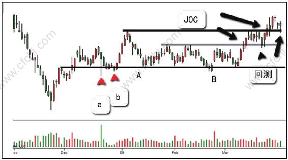 K线a是震仓,主力资金故意突然压低价格的两个目的是:逼迫抄底跟风者离场和引诱空头做空。从JOC角度观察市场,K线a是对JOC形成的支撑的回测,但是这个回测带来大量的卖盘,不是理想进场点。K线b是二次测试,从低成交量可以看出供应已经枯竭,确认了震仓行为,在这里可以进场。