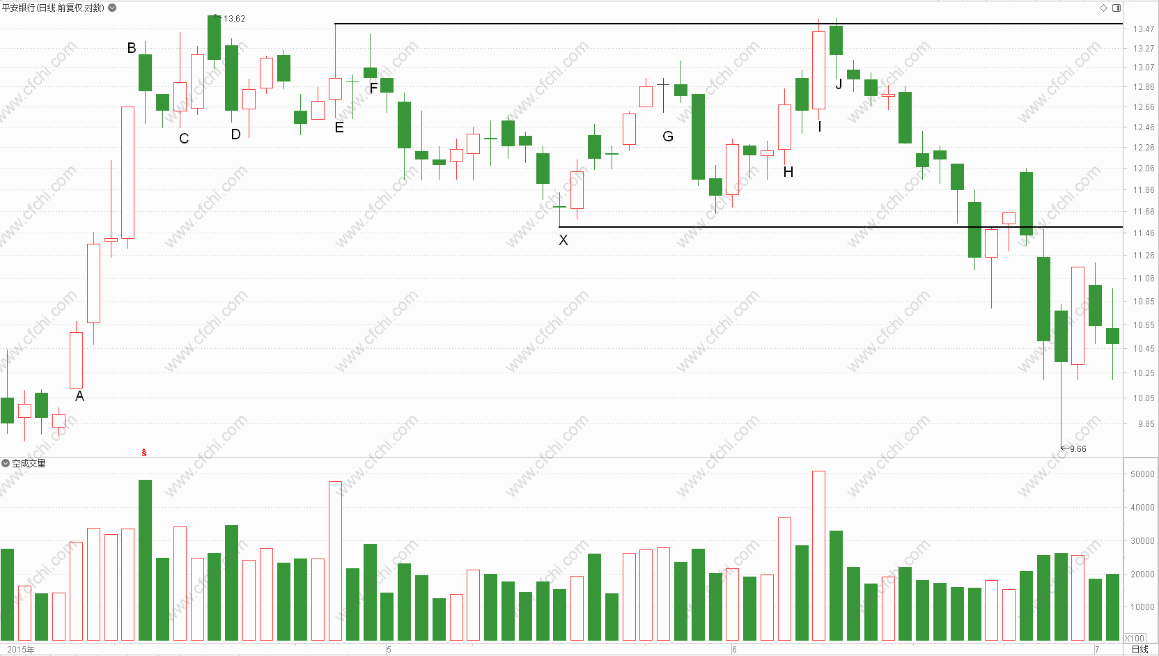 如图2.2所示,从H开始的巨量上涨再次给了公众鼓舞。前期被套的公众再次燃起了希望,伴随着美丽的发财梦想,有的借钱加仓。场外其他买家看到涨得这么漂亮,纷纷涌入市场。I进入阻力区,只要JOC,就能恢复上涨趋势的秩序。但是JOC需要钱,要知道顶部价位聚集着众多被套的公众,他们正着急地等着回本,而要吃掉这么大供应,市场需求巨大的资金,这种资金规模只能来自主力机构,公众没有这个能力。但是前面我们已经看到很多主力资金的出货现象,他们现在能一下子变成买家并解救那些被套的公众吗?显然不会。I的巨量消耗了大量需求和供应,如果主力资金看涨并且使用更大的资金来吸收顶部供应,价格会JOC。但是J的量价行为让我们完全看清了主力的意图,主力资金还在出货,他没有站在买方的队伍里。从这里开始,平安银行从顶部14元左右一直跌到7.5元以下。