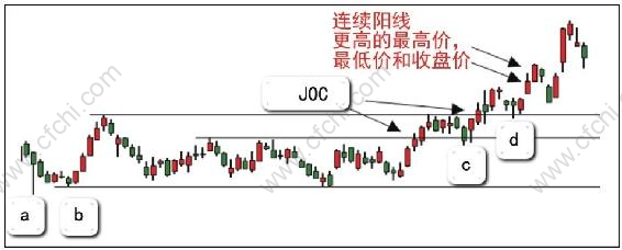 如图2.1所示,K线d是JOC回测,可以进场,然后出现连续的阳线,特点是更高的最高价、最低价和收盘价,这是牛市特征,确认了我们的进场,也延续了牛市的秩序。如果没有这种情况出现,价格可能进入横盘整理阶段(我们等待下一个JOC和回测再进场)。一旦出现阴线回调伴随扩大的成交量的现象,减仓或平仓离场。