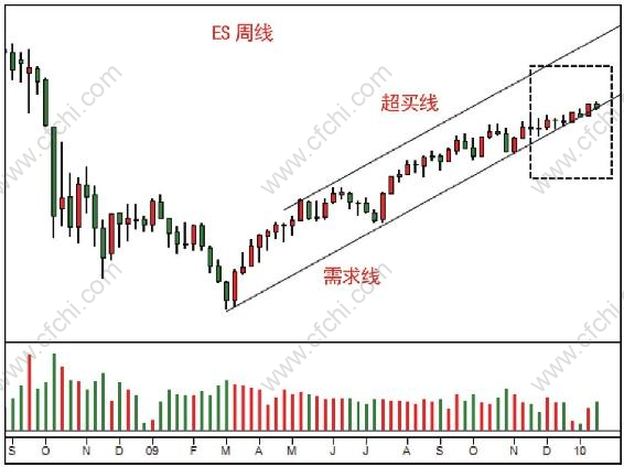 如图1.1A所示,虽然周线的上涨迟缓,需求匮乏,但是日线上价格依然不断创新高,支撑位也不断提高,图上标出了两个重要支撑。