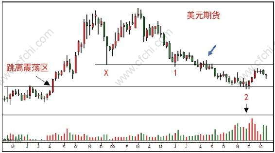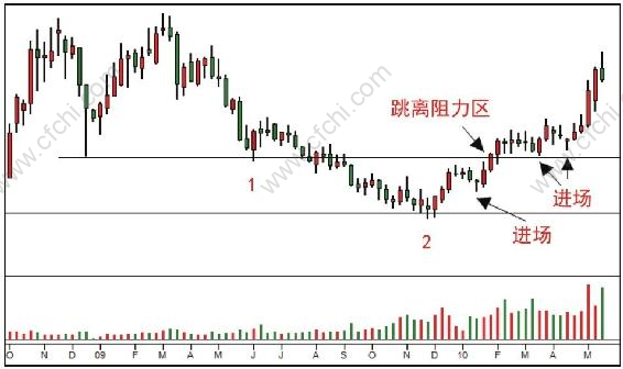 如图2.3所示,SOS后测试结果是阳线出现,表明需求继续控制市场,可以进场。接下来出现JOC,确认了我们的进场。在回测JOC的时候,我们有了新的进场点。其中第一次回测的量很大,说明浮动供应依然存在,我们期待第二次测试。后面的回测是个小十字星,回测过程就像蜻疑点水,明显供应不足,这是比较好的进场时机。
