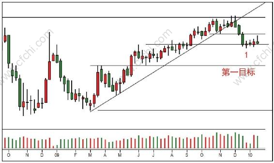 如图1.2所示,背景是上涨中价格突破上升趋势线(同时突破死角),扩大的成交量和阴线意味着市场背景可能会转变,下而关键看价格是如何反弹测顶的。反弹从K线1开始,连续4个短K线,没有任何上涨力度,虽然最后两根成交量大幅增加,但是低收盘说明供应超过了需求,行情看跌。