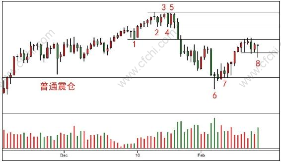 如图2.1所示,价格迅速跌破K线1和K线2处的支撑,有些超卖的味道,但是没有迅速反弹,说明需求不足,随后市场继续下跌。K线6是前期支撑处的Spring,是下降停止行为(也是小型抛售高潮),我们需要二次测试来观察后续市场的供应是否缩小或衰竭。K线6后面是二次测试,成交量缩小,表明供应衰竭,可以进场。K线7之后出现强势上涨(需求强劲),然后又是低量测试,形成了死角。在支撑区形成死角,供应不足,此时需求稍作努力就能引起价格上涨,后面一天出现了死角突破。但是这个上涨面临的第一个压力就是冰线区,如果已经做多,冰线是出场价位。K线8是回调中出现的Spring,表明需求吸收供应并把价格抬高。如做多,需要二次测试确认,因为这个Spring的量告诉我们供应没有减弱。此时空头更关注反弹过程,如果他们看到反弹没有需求增加的现象,他们会立刻做空。
