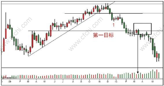 如图1.1,从这个周线图中,我们第一眼能观察到什么市场行为?这种行情有没有交易机会?价格处在上升轨道中,但是低迷的市场让人感到不好判断。答案就在成交量上。