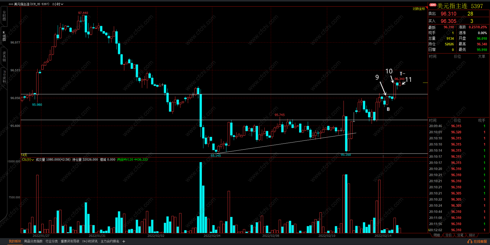 K线11小幅新高后马上回落(UT),同时,这根K线只过了一个小时,但是成交量已经差不多跟前一K线相当了,这些现象说明供应略强于需求,这会导致回落,我们减仓,并且观察下方JOC位置是否能撑住。