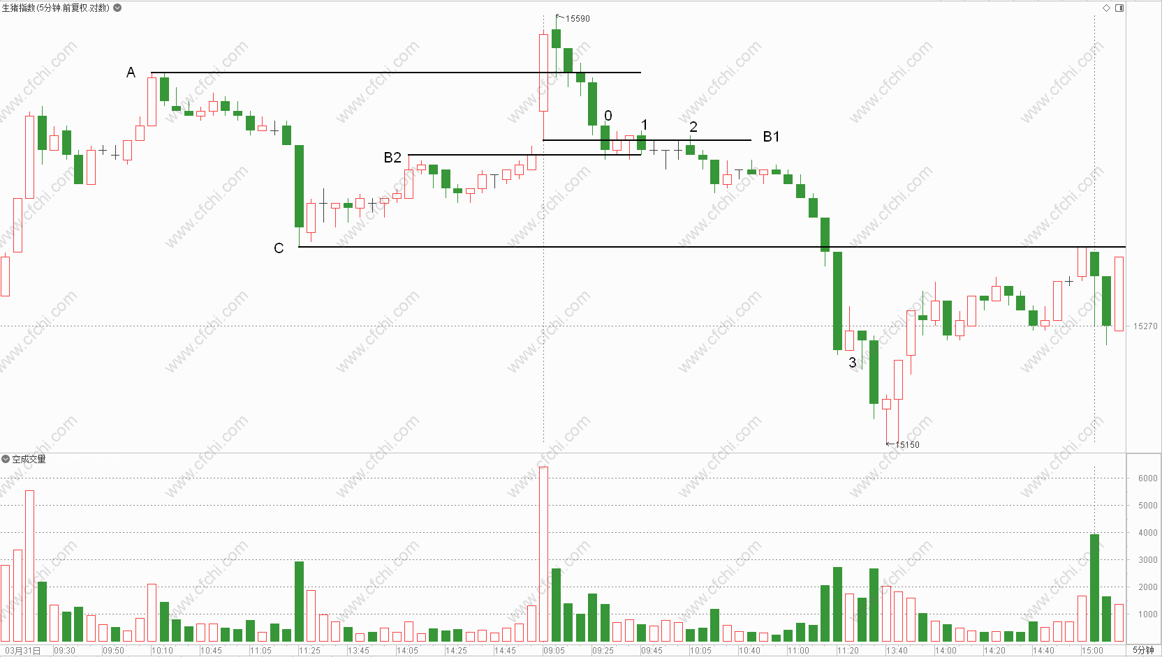 K线0:V反之后在水平线B1与B2之间震荡,两根阳线成交量低且没有突破K线0的高点,说明需求力度不足。