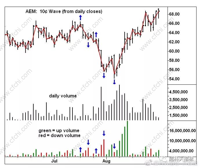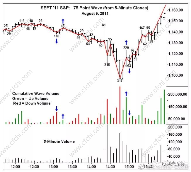 任何人观察日内价格运动,就能发现它是由一系列的上升的买入浪和下降的卖出浪构成的,价格运动不是在同等时间内完成的,当价格运动结合时间来看的时候,趋势是容易识别的,但是成交量的趋势并不明显,传统的K线成交量掩盖了真正的买入和卖出力道。为了改进此缺点,维斯波从波的角度绘制成交量。