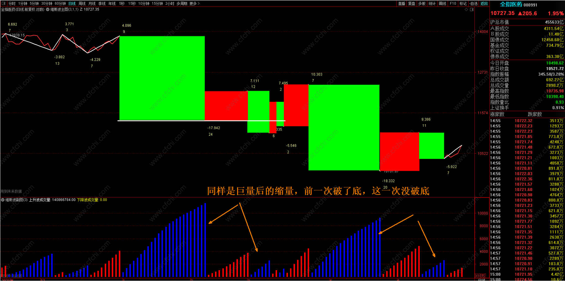 副图:柱体是波段累计的成交量,即把波段中的每一天的成交量加在一起,箭头4指向的是波段成交量总和的输出值,当天输出的数值已经是累计了,不需要再把前几天的加在一起了。