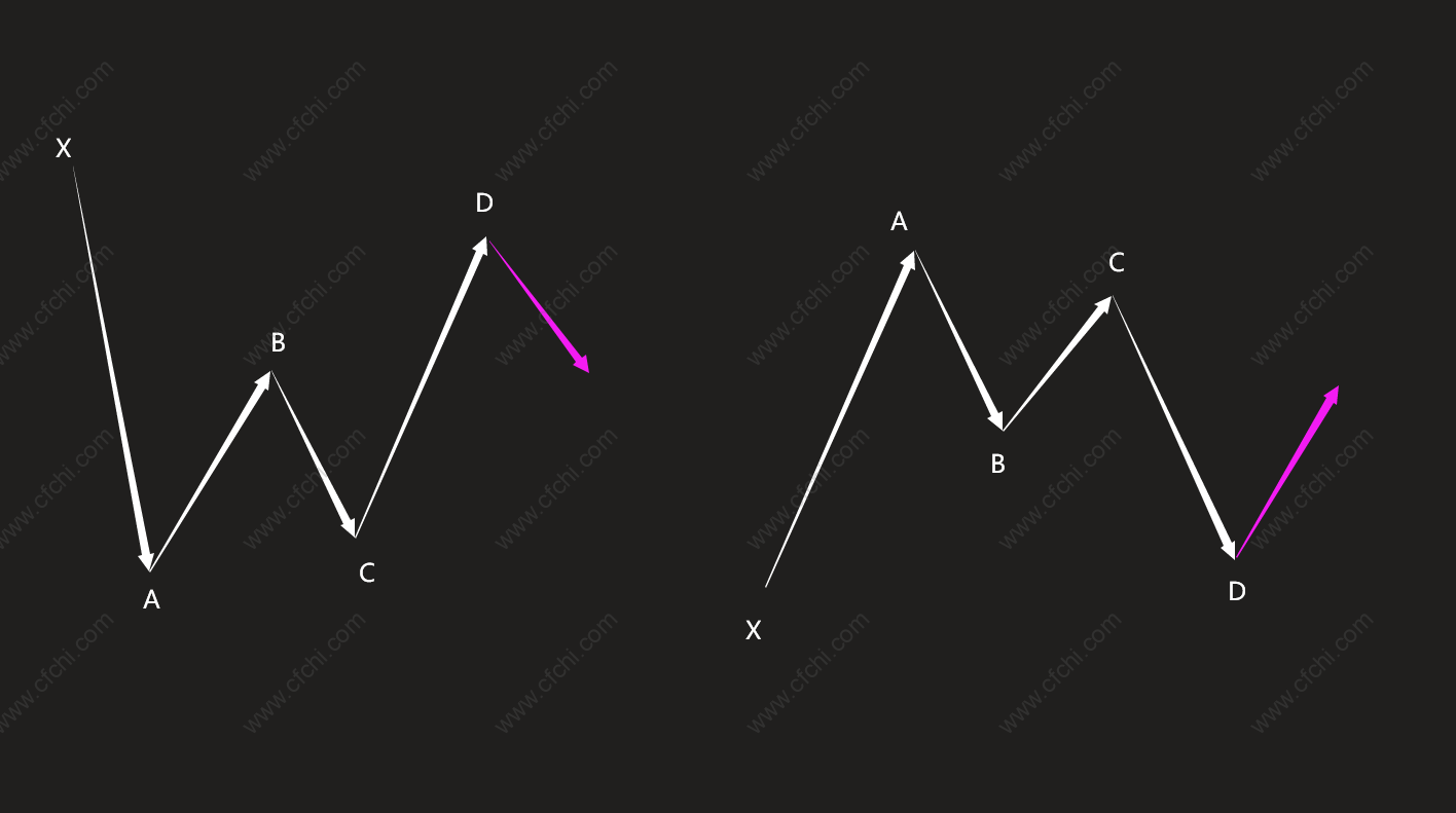 如图1,左边为蝙蝠看跌形态,右边为蝙蝠看涨形态。