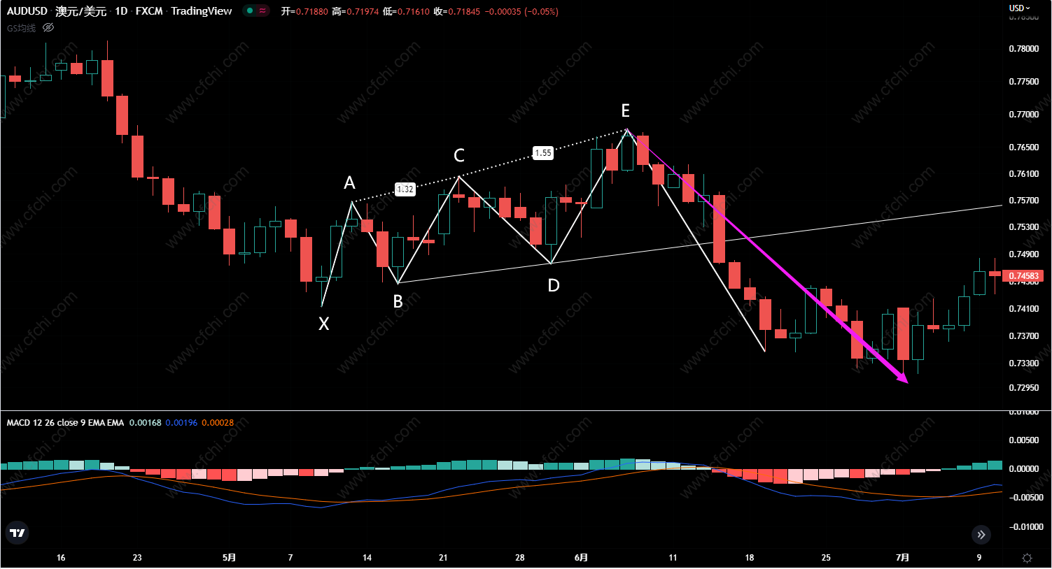 如图,澳元/美元,2018年5月,三驱看跌形态,跌幅远比BD连线更深。