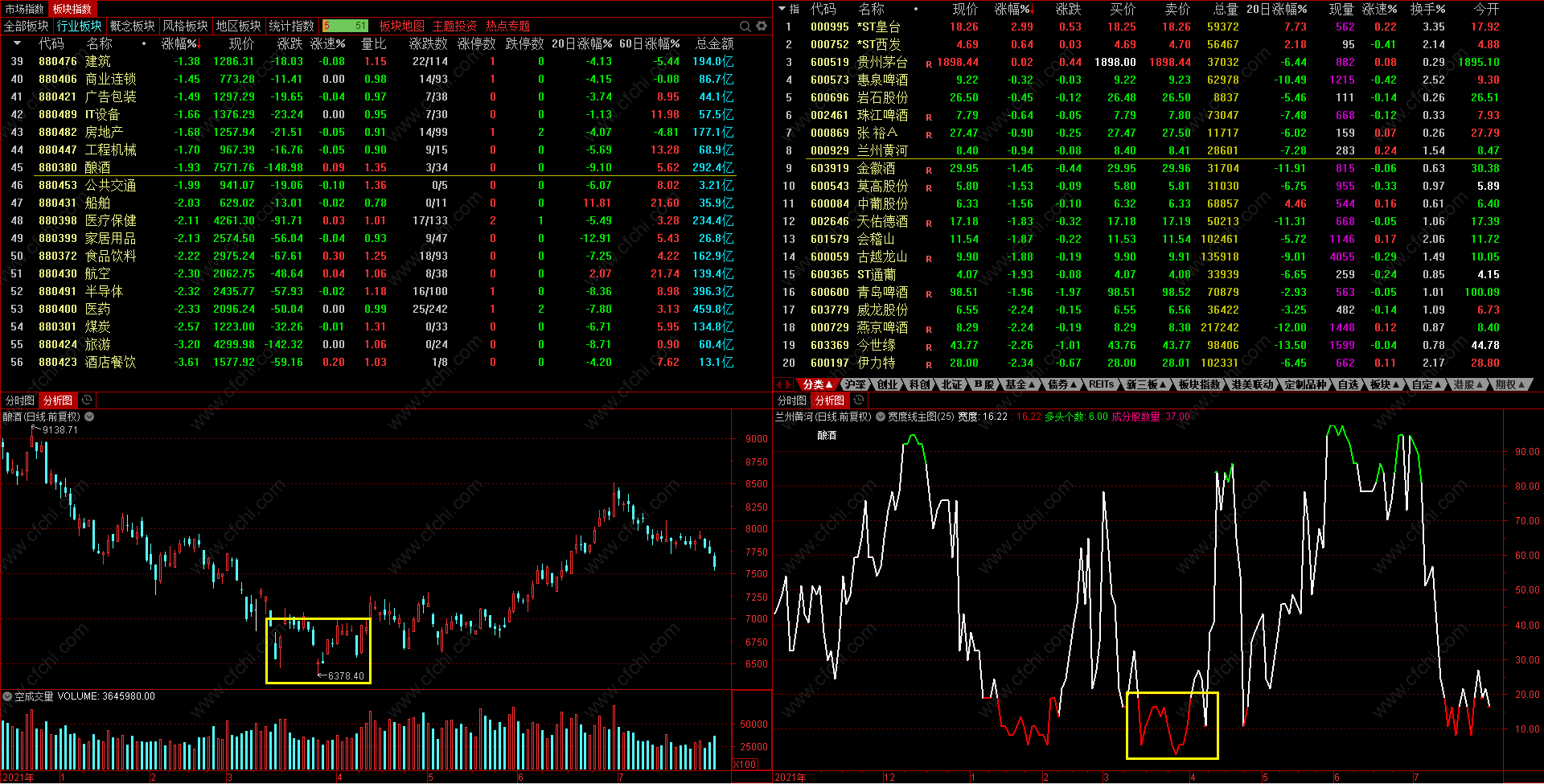 这一段时间,宽度线显示红色,即宽度小于20,意味着酿酒行业内,80%以上的个股都处于空头趋势中,即酿酒行业处于情绪低位。情绪回升以后,行业指数也是走出了一段比较不错的涨幅。