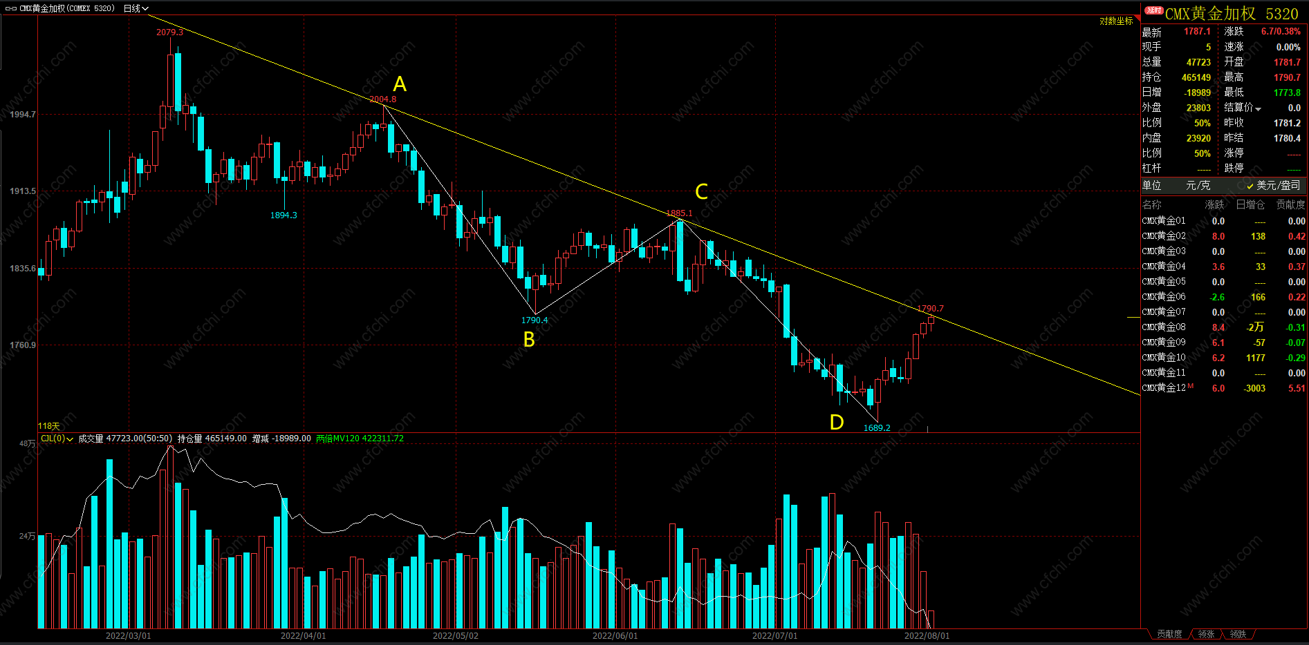 这个走势连我给的简化菱形形态的要求都没有达到,依然能够反弹到AC连线。而且,根据我们对黄金基本面的判断,这还不是黄金本轮行情的终点。