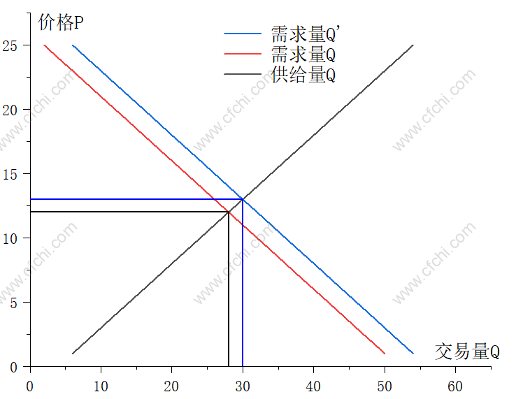 供求规律是指在其他条件不变的情况下,需求和供给变动使得商品价格变动。需求变动引起价格同方向变动,供给变动引起价格反方向变动。如图,需求增大,使得价格上涨。