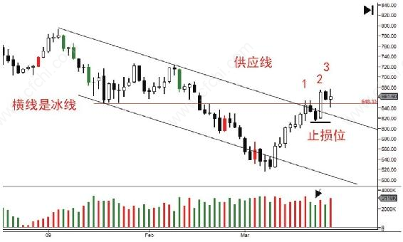 如图3所示,目前市场背景是下降趋势,符合下降趋势的供求秩序。下轨是超卖线,走势出现超卖行为之后,反弹突破了供应线。原本供应线上应该有大量卖单流入,吸收买家资金并阻止价格上涨。如果在回落中没有看到大量卖单流入市场,说明市场上缺乏供应,需求会继续主导市场。在供应线上的博弈也和普通阻力区的供求博弈相同。图中横线我们叫作冰线,这个我们以后会经常提到。下面我们解释主要量价行为的细节。