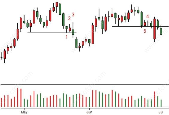判断支撑是否有效,主要看从支撑处起来的强度。假如你在支撑位进场买入,说明你假设了这里有大量买单流入而阻止了下跌。如果接下来的几天没有表现出持续的需求,反而是低量小幅波动,说明没有大量买单流入市场,这个支撑无效,我们应立刻出场等候。蜡烛1到达支撑位置出现反弹,这是个很好的停止行为。它的振幅小说明下跌进度缩小,高成交量说明卖单流入很多,但是缩小的振幅说明这么大卖单流入没有结果。按照习惯,在支撑上出现下跌终止行为,价格应该反弹并上涨。我们关注接下来的反弹力度,因为它可以告诉我们这个支撑是否有效。蜡烛2的涨幅却是非常的小,冲高之后收在中部,说明市场没有足够的买单流入来跟随这个反弹。蜡烛3是供应继续主导市场的信号,上影线说明当日卖单流入量大于买单(供应战胜需求),同时成交量扩大,这说明反弹遇到了强大的供应(主力高抛所致)。结论是支撑无效,导致价格继续下跌。蜡烛3和4的情况与蜡烛1和2相同,同样是支撑上没有需求接盘,导致支撑失效。通过蜡烛1、2、3、4的行为,我们知道支撑失效的理论根据成立,预示着后市继续下跌。如果你不幸抢了反弹,看到以上行为,立刻出场,不要用自己的情绪和希望来否定市场本质行为。