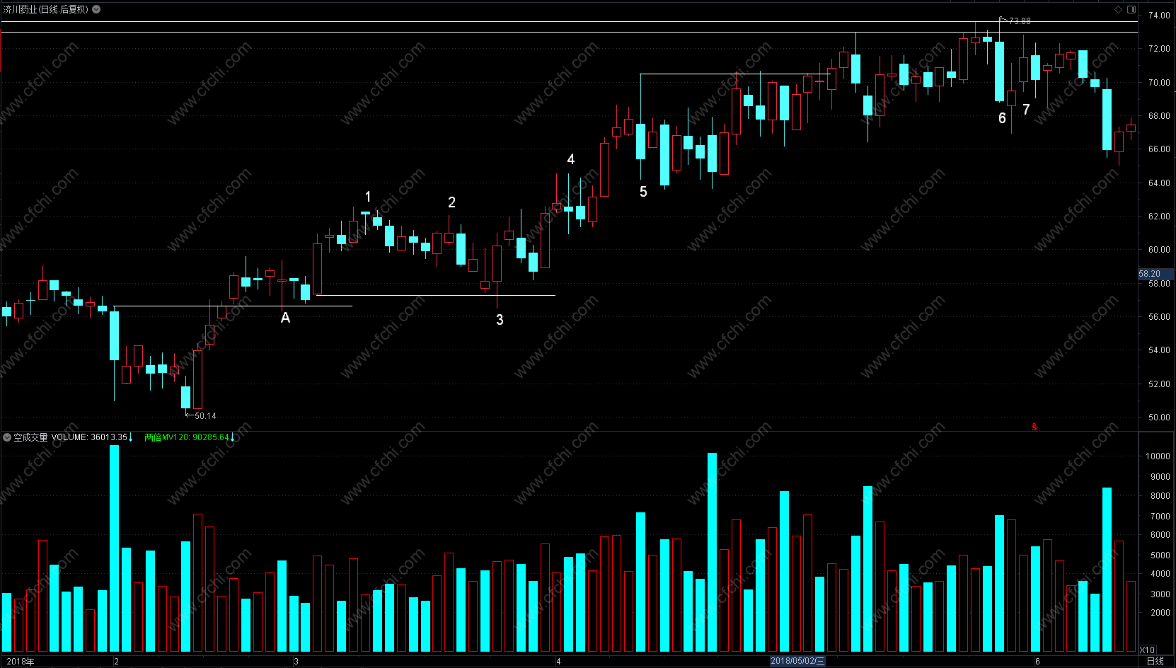 下面我们以济川药业日线为例(图1),时间2018年2月到6月,讨论一下上涨趋势中的成交量行为。图中上方是大盘,下方是个股。上涨趋势,如果持仓的话,我们捋着这条线: