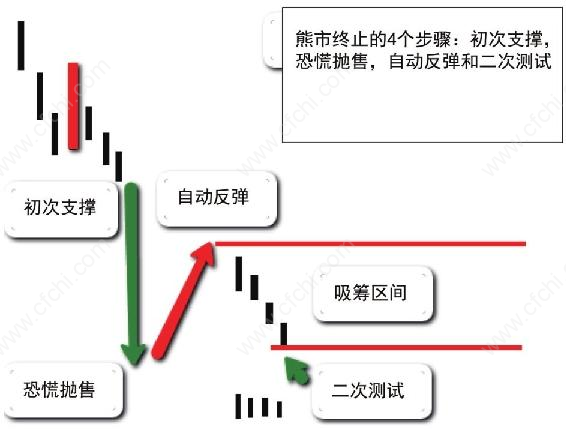 初次支撑之后,市场进入恐慌抛售,然后是自动反弹和二次测试。如果这四种行为全部清晰地出现在图上,我们判定熊市终止。