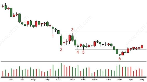 K线4:这是二次测试。成功的二次测试是K线和成交量都必须小,这样才表示熊市暂时中止。但是K线4不是这种情况,它的成交量非常大,说明测试过程中市面上的股票供应还很多,证明熊市没有终止。