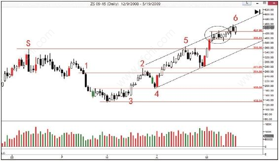 第二,通道的上轨属于超买线,但是关键要看在这里是否有大量卖单流入市场(供应的出现),如果有供应扩大的现象,价格会返回通道中。但是在这个窄幅盘整中,我们没有看到供应的出现,相反,需求依然保持优势,因为很多蜡烛收盘价格都收于中部或中部以上位置。我们判定,既然没有供应,上升趋势还没有改变。