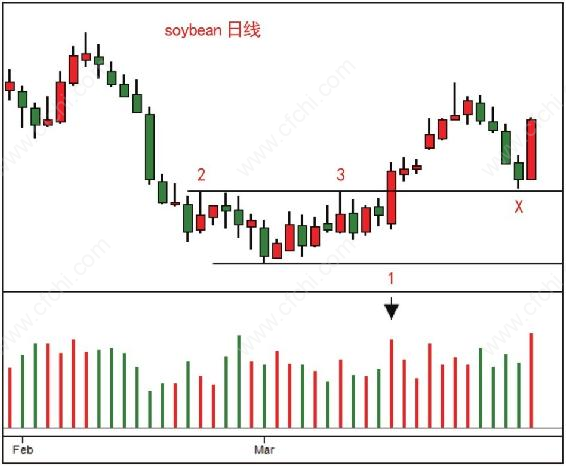 从蜡烛2开始的回落,看成交量,属于递减情形,我们判断供应正在枯竭,特别是价格接近现在成为支撑的位置,出现了停止行为,因为在成交量与前一天相同的情况下,蜡烛波动幅度大幅减小,说明需求再次战胜供应。4号蜡烛的强力反弹告诉我们需求持续强劲,此时我们不能再犹豫,应立刻进场,因为市场还是在供不应求背景当中。