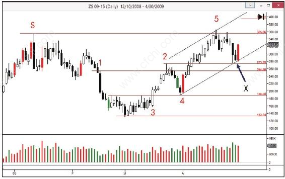 5号蜡烛:在供应区出现上冲回落,看似终止行为,但是看趋势,上升趋势中的上冲回落属于探索,不是反转信号,这在蜡烛2那里我们讨论过,所以蜡烛5给我们提供的信息与蜡烛2一样,在试探供应区之后,如果接下来的回落没有大量供应出现,牛市依然存在,同时也给了我们进场的准备信号。从蜡烛5开始的回落当中,蜡烛X是停止行为,因为它的高成交量对应了窄幅的价格波动(短蜡烛),这个类型的停止行为说明需求在超过供应。